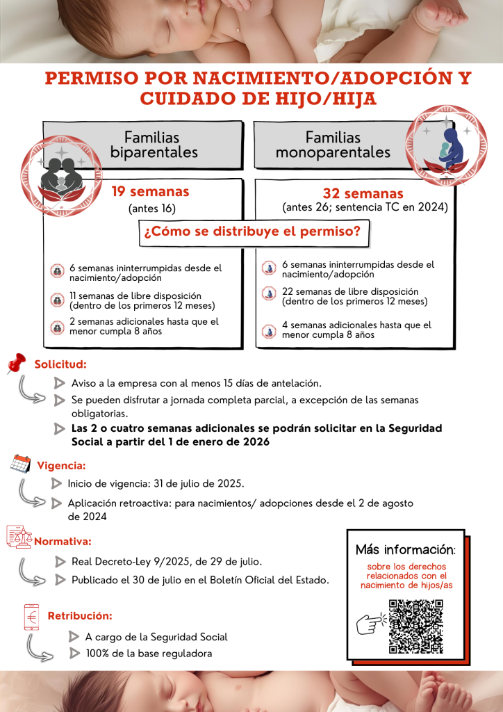 Válido desde el 1 de enero de 2026 para niños y niñas nacidos desde el 2 de agosto de 2024. No se transfiere el permiso entre progenitores, salvo fallecimiento. En familias monoparentales, se extiende a 32 semanas.