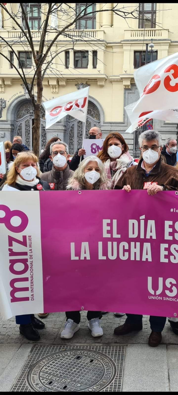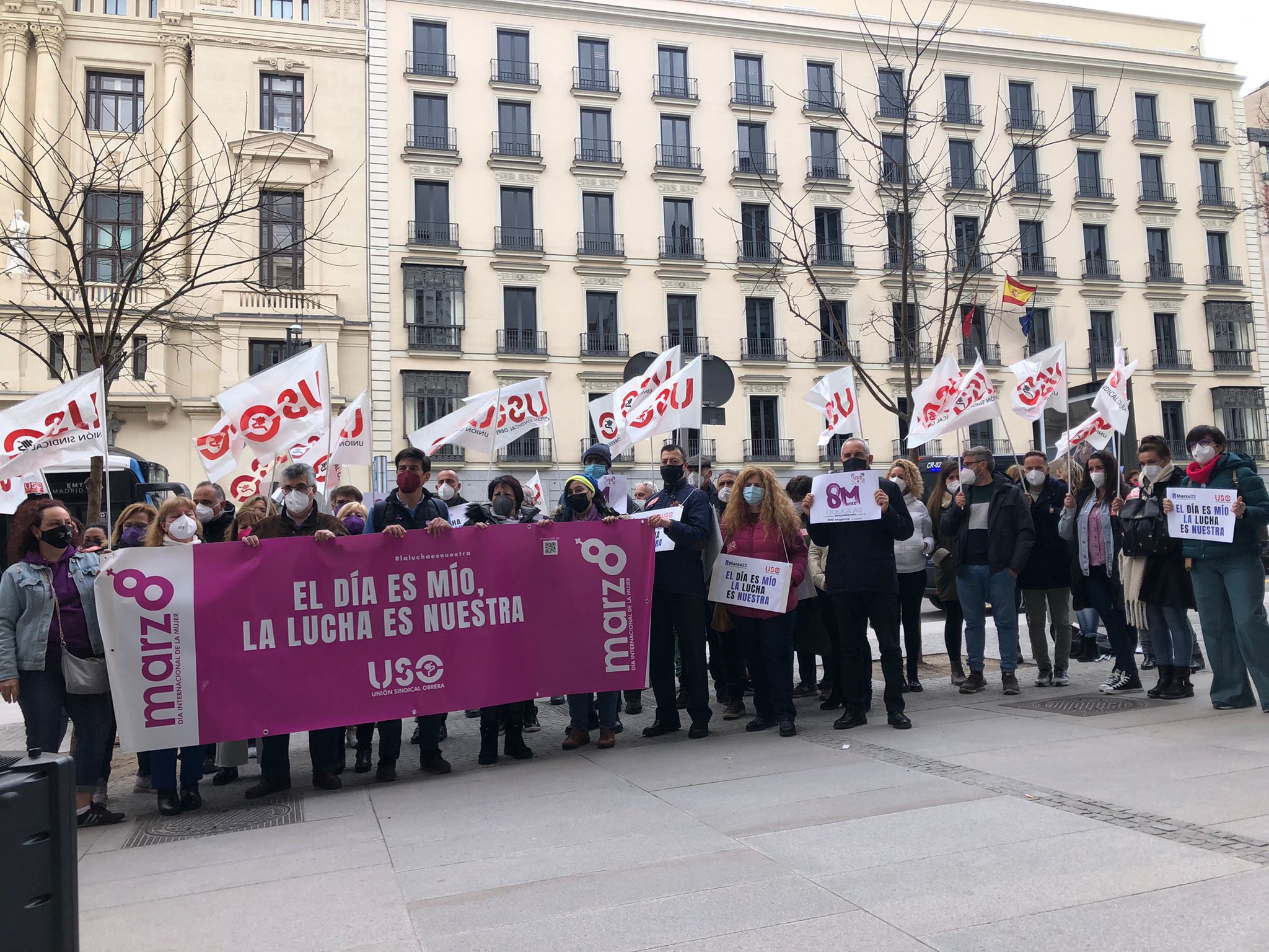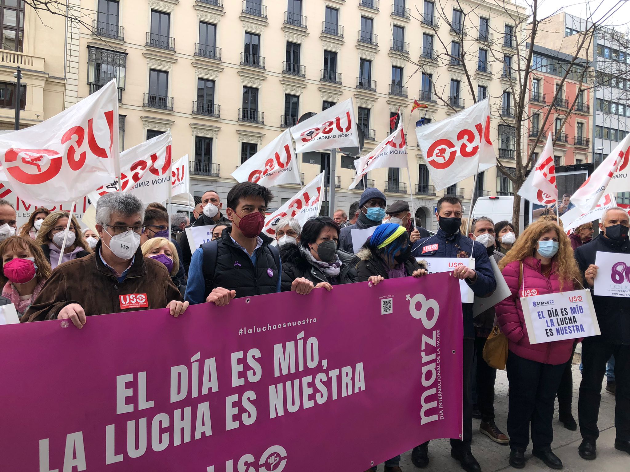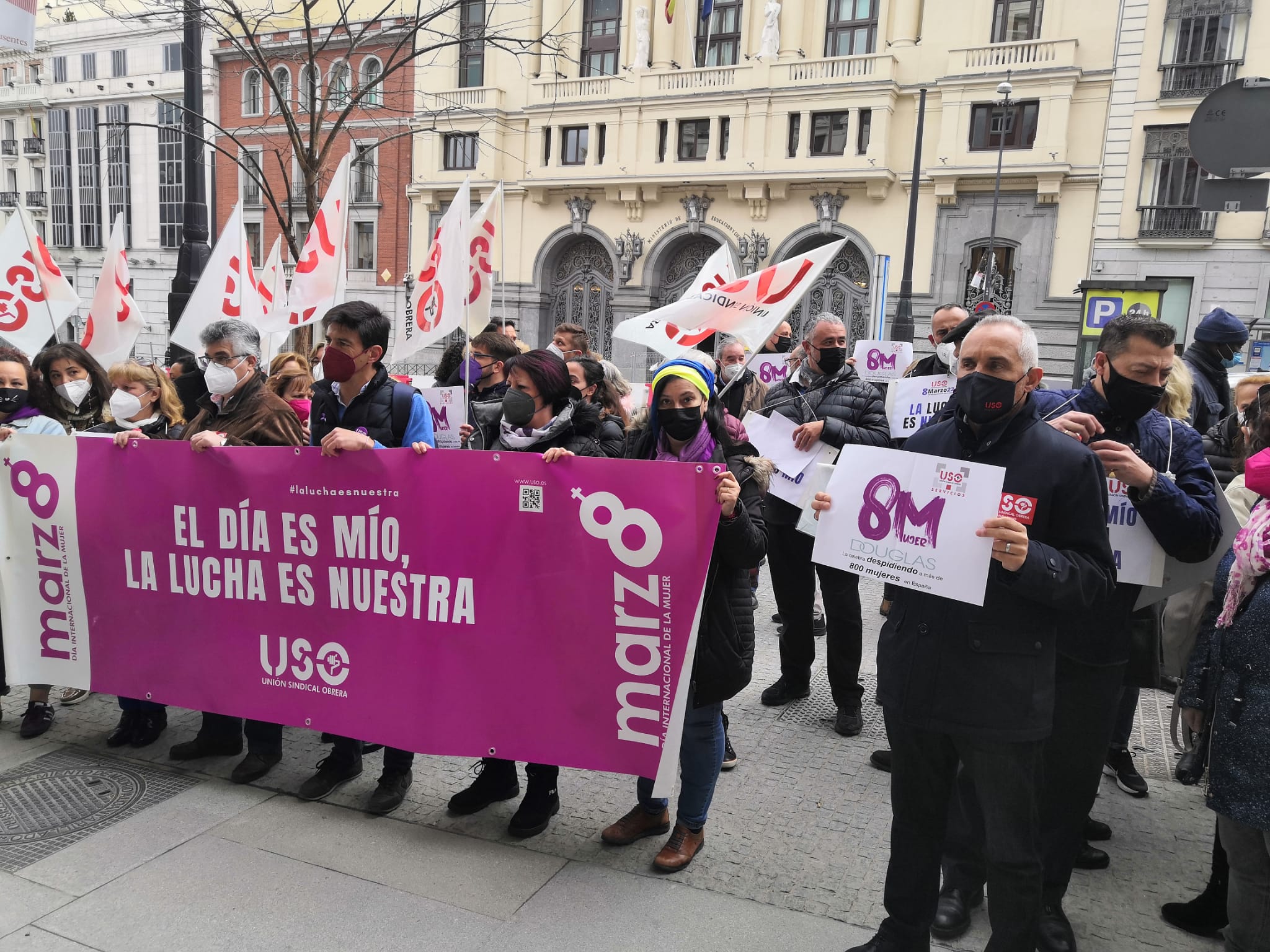 Frente al Ministerio de Igualdad, en Madrid, miembros de la Ejecutiva Confederal de USO, con su secretario general, Joaquín Pérez, a la cabeza; de las federaciones profesionales del sindicato, de USO-Madrid y delegados de Douglas y Ferrovial Servicios, entre otros, han reivindicado el lema de este 8M: “El día es mío, la lucha es nuestra”. Y es que para alcanzar la igualdad real entre mujeres y hombres es necesaria la implicación de estos para acabar con el desigual reparto del tiempo de trabajo remunerado y los cuidados. Solo de esta manera, se pondrá fin a la importante brecha de género a nivel laboral y económico que existe hoy en día entre hombres y mujeres y se ha visto agravada por los efectos de la pandemia. Durante la concentración, USO ha hecho llegar al Ministerio de Igualdad las reivindicaciones de este 8M: que las mujeres no tengan que dejar de participar en la vida pública y laboral; que las políticas de igualdad aprobadas hasta ahora y las futuras eviten que se sigan reproduciendo los roles tradicionales de género y, sobre todo, lograr un cambio cultural que lleve a la corresponsabilidad, a la implicación de toda la sociedad, especialmente de los hombres, así como al reconocimiento de los diversos modelos de familia. También, una representación de las mujeres de la USO han procedido a la lectura del manifiesto, con una mención especial a la situación de Douglas, empresa que ha anunciado la aplicación de un ERE que afecta a la práctica totalidad de su plantilla, entre las que se encuentran unas 800 mujeres trabajadoras.