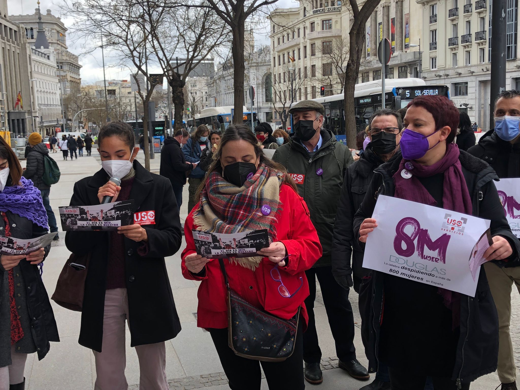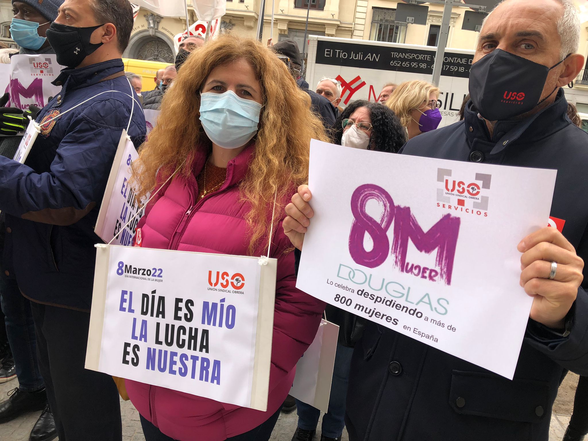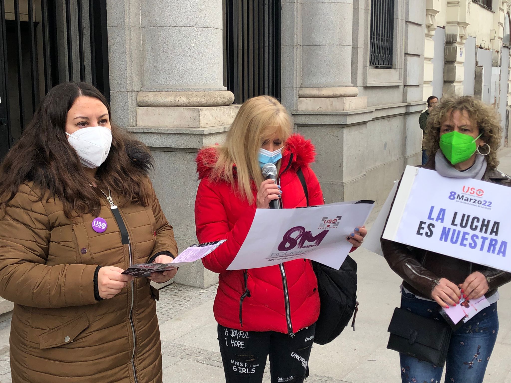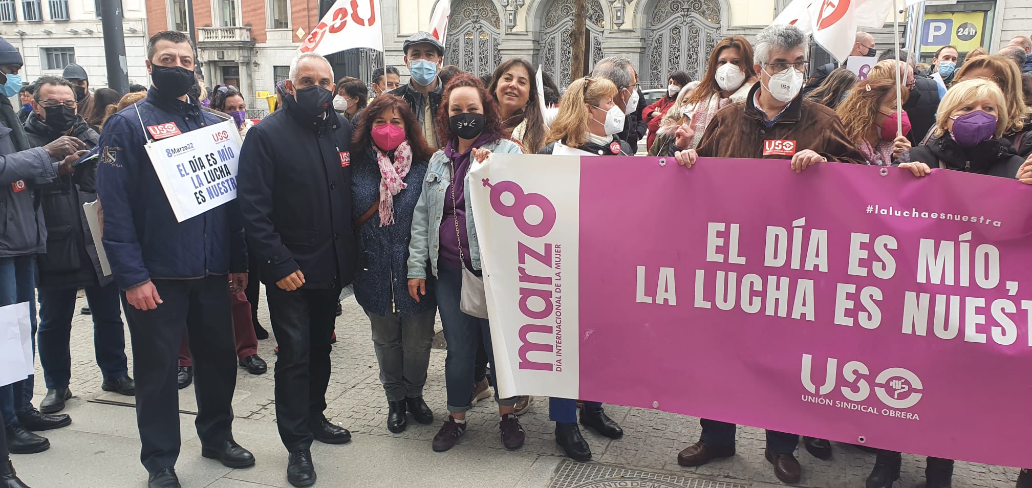 Frente al Ministerio de Igualdad, en Madrid, miembros de la Ejecutiva Confederal de USO, con su secretario general, Joaquín Pérez, a la cabeza; de las federaciones profesionales del sindicato, de USO-Madrid y delegados de Douglas y Ferrovial Servicios, entre otros, han reivindicado el lema de este 8M: “El día es mío, la lucha es nuestra”. Y es que para alcanzar la igualdad real entre mujeres y hombres es necesaria la implicación de estos para acabar con el desigual reparto del tiempo de trabajo remunerado y los cuidados. Solo de esta manera, se pondrá fin a la importante brecha de género a nivel laboral y económico que existe hoy en día entre hombres y mujeres y se ha visto agravada por los efectos de la pandemia. Durante la concentración, USO ha hecho llegar al Ministerio de Igualdad las reivindicaciones de este 8M: que las mujeres no tengan que dejar de participar en la vida pública y laboral; que las políticas de igualdad aprobadas hasta ahora y las futuras eviten que se sigan reproduciendo los roles tradicionales de género y, sobre todo, lograr un cambio cultural que lleve a la corresponsabilidad, a la implicación de toda la sociedad, especialmente de los hombres, así como al reconocimiento de los diversos modelos de familia. También, una representación de las mujeres de la USO han procedido a la lectura del manifiesto, con una mención especial a la situación de Douglas, empresa que ha anunciado la aplicación de un ERE que afecta a la práctica totalidad de su plantilla, entre las que se encuentran unas 800 mujeres trabajadoras.