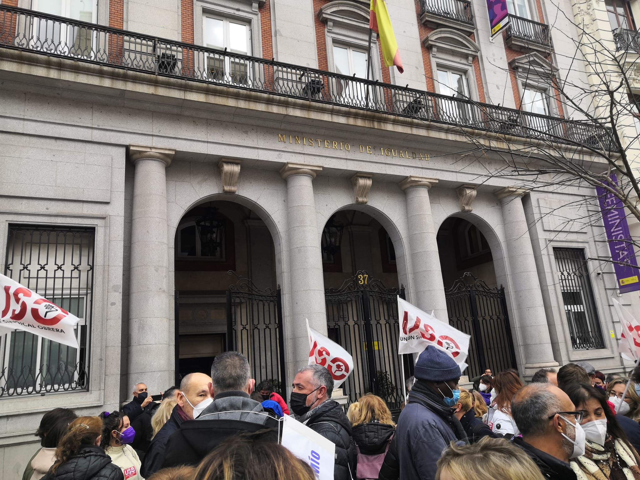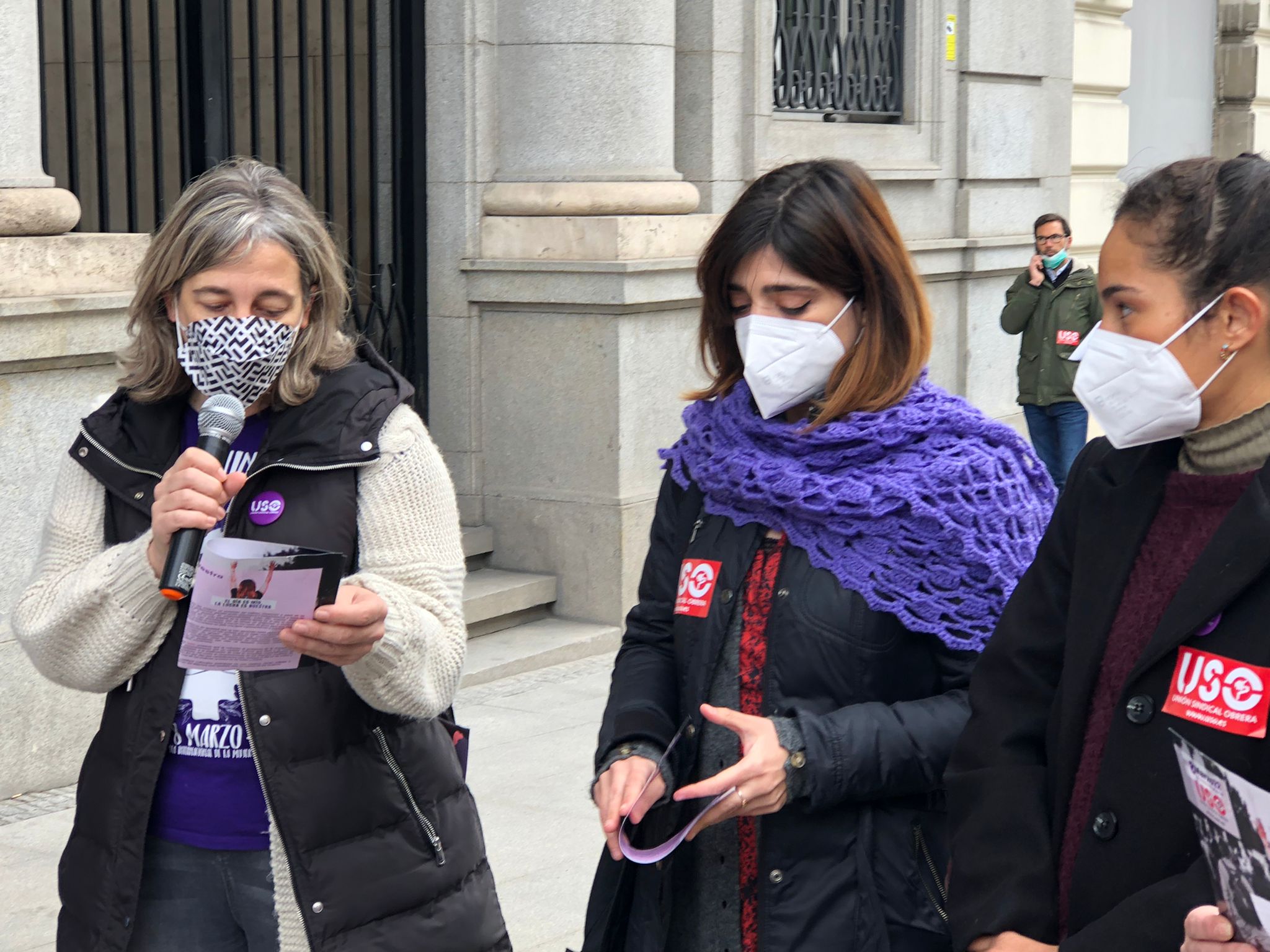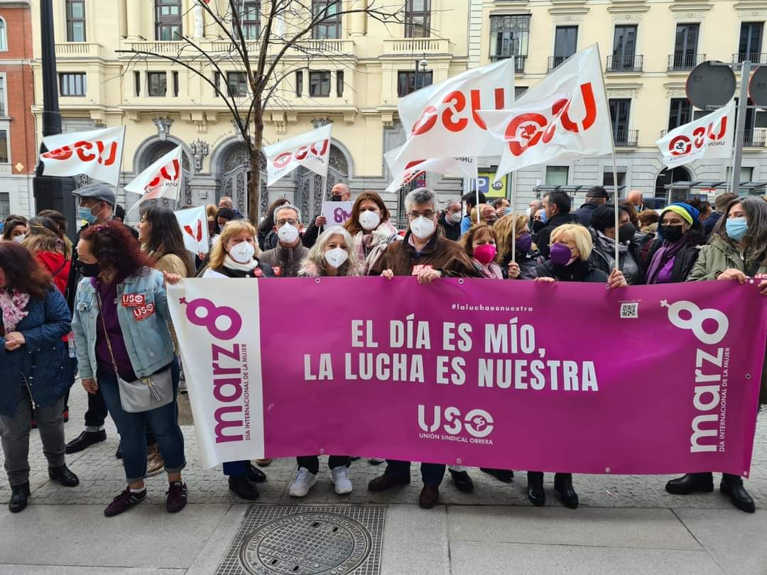 8M, USO se ha concentrado frente al Ministerio de Igualdad, en Madrid, para reivindicar que aunque el día es de la mujer, la lucha es de todos, para lo que es necesario que los hombres se impliquen