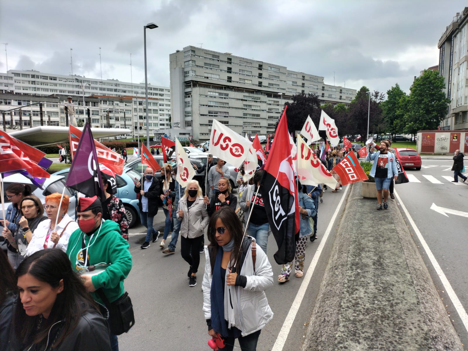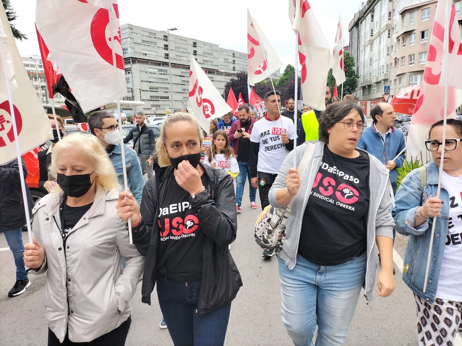 Las representantes de USO-Galicia encabezan la manifestación que se celebró en la zona de Matogrande, sede de la empresa de Contact Center en la ciudad herculina