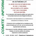En el día de ayer, jueves 29 de octubre, los trabajadores de Autobuses Lat se han concentrado de 8:30h a 10:30h en la Glorieta del Ayuntamiento y de 11:00h a 12:00 h en la Plaza de Santoña de la ciudad de Murcia. Han salido a la calle nuevamente para reivindicar el abandono del transporte público por parte de la Comunidad Autónoma de Murcía, así como exigir el restablecimiento de los servcios de la concesión de autobuses LAT MU- 093.